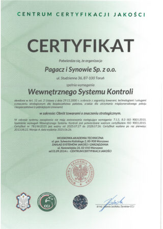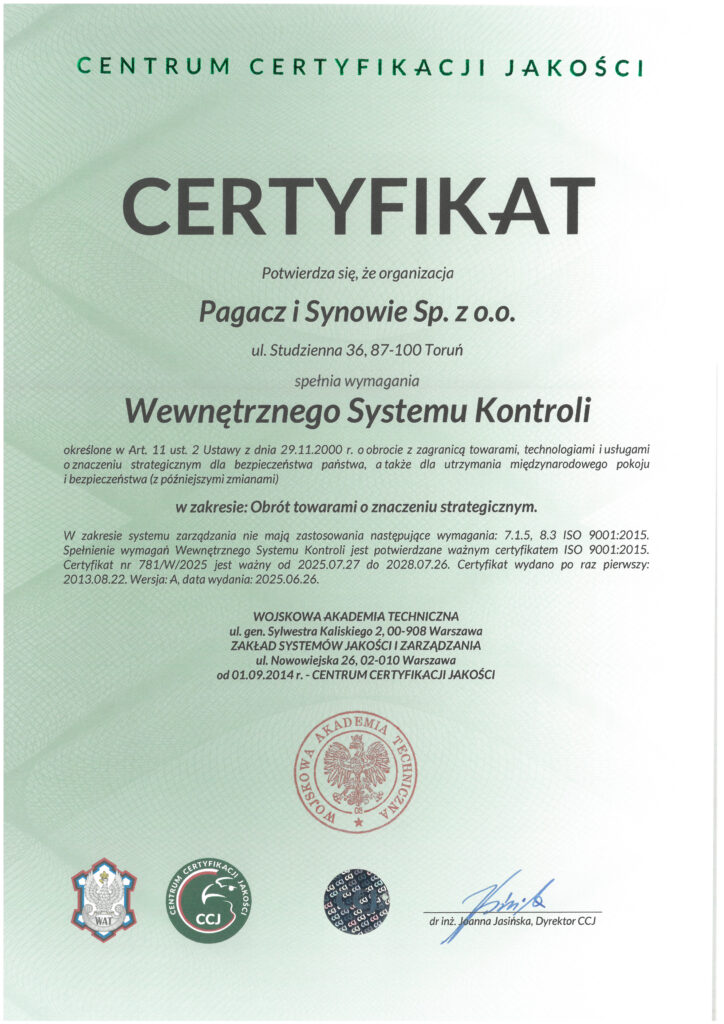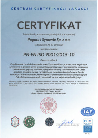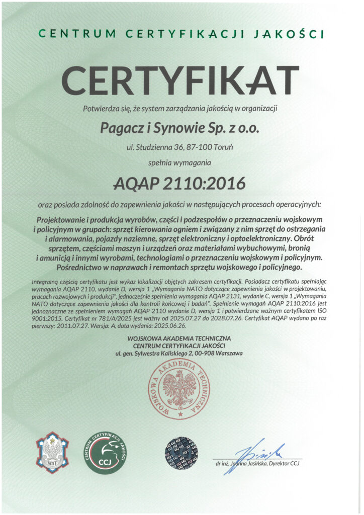 Firma Pagacz Defence Group posiada wieloletnie doświadczenie na rynku, które z uznaniem zostało potwierdzone przez najwyższej jakości standardy, zintegrowane procedury zarządzania jakością, obejmujące procesy organizacyjne wraz z kompleksowym system zarządzania firmą, które mają odzwierciedlenie w prestiżowych certyfikatach ISO 9001:2015 oraz AQAP 2110:2016.